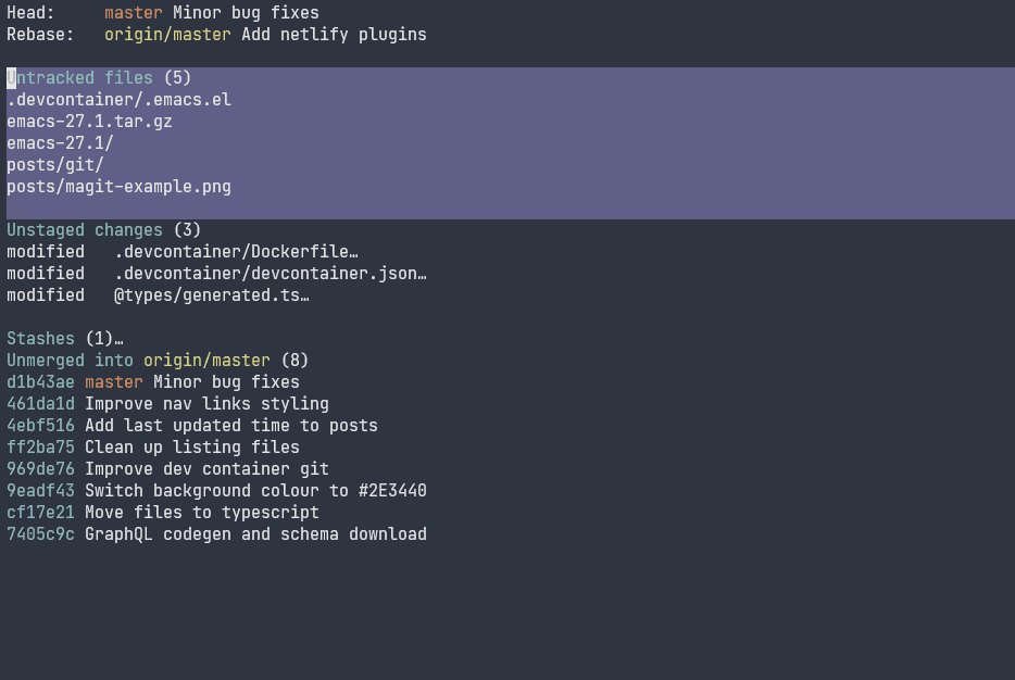 I recently switched to using Magit for all my Git work. Magit is a text-based interface for Git which was originally developed as an Emacs package. Although there appears to be other ports now for VSCode and Vim, I decided to use the original because I wanted the smoothest experience and I don’t know how complete those ports are.